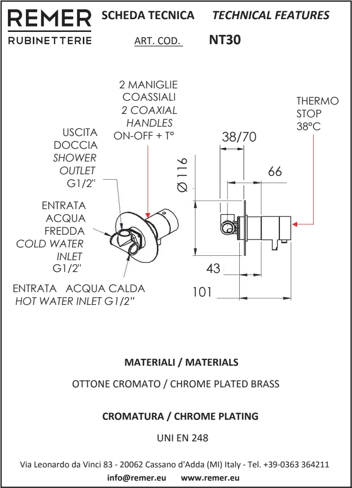 Коллекция ELEGANCE разрабатывается и производится компанией Remer Rubinetterie с особым вниманием к деталям. Она использует высококачественные материалы и передовые технологии, чтобы всегда предлагать наилучший комфорт, безопасность и расслабление. Также доступны только встроенные компоненты (арт. NT30B) и только внешние компоненты (арт. NT30E).