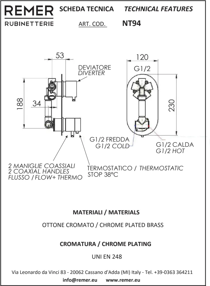Смеситель для душа Remer Elegance хром NT94 – это современное решение для ванной комнаты, созданное для обеспечения максимального комфорта и безопасности. Этот встраиваемый термостатический смеситель оснащен рукояткой-переключателем и четырьмя выходами, что делает его идеальным выбором для душа.