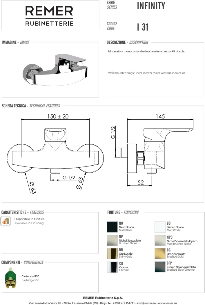 Смеситель для душа Remer Infinity настенный хром I31 - это стильный и функциональный элемент вашей ванной комнаты, который станет гармоничным дополнением современного интерьера. Изготовленный из высококачественной латуни, смеситель отличается надежностью и долговечностью. Модель предназначена для установки на стену и имеет рычажное управление, что обеспечивает удобство и точность регулировки температуры и напора воды. Стильный хромированный глянцевый внешний вид добавляет изделию элегантности, а балансная форма гармонично вписывается в дизайн любого душевого пространства. Межосевое расстояние в 150 мм обеспечивает удобство монтажа на стандартные душевые коммуникации. Подходит для душа, не имеет излива. Продукт от известного бренда Remer из коллекции Infinity станет идеальным выбором для тех, кто ценит качество и стиль.
