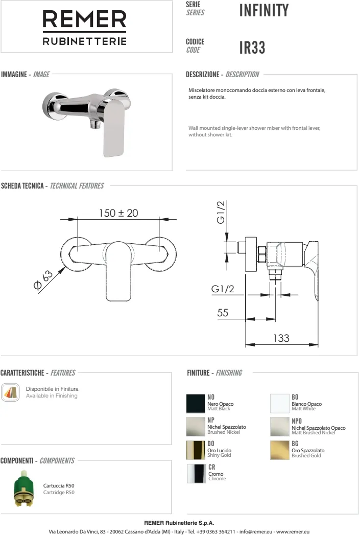 Смеситель Remer Infinity хром IR33 — это стильное и современное решение для тех, кто ценит качество и изысканный дизайн. Этот смеситель предназначен для душа и выполнен в современном стиле, что делает его идеальным дополнением к любой ванной комнате. Изделие имеет удобное рычажное управление, что обеспечивает простоту в использовании и позволяет легко настраивать температуру и напор воды. Смеситель монтируется на стену и не имеет излива, что делает его компактным и функциональным решением для душа. Хромированное покрытие добавляет изделию элегантности и защищает его от коррозии, что гарантирует долгий срок службы. С межосевым расстоянием в 150 мм смеситель легко интегрируется в существующую сантехническую систему.