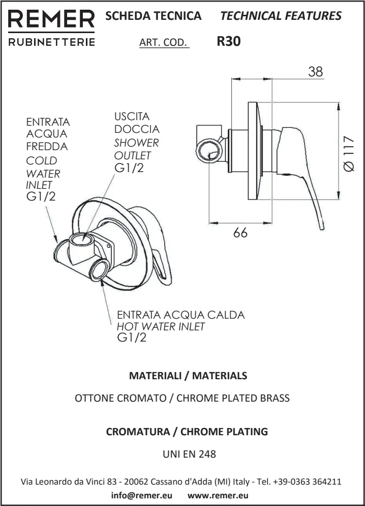 Смеситель для душа Remer Remix R30 представляет собой высококачественное изделие для скрытого монтажа, выполненное в классическом стиле. Этот смеситель оснащён удобным рычаговым механизмом управления и предназначен для использования в душе. Основным отличием данной модели является её округлая форма и возможность выбора различных комплектаций: только встроенные компоненты (арт. N 30 B) или только внешние компоненты (арт. R 30 E).