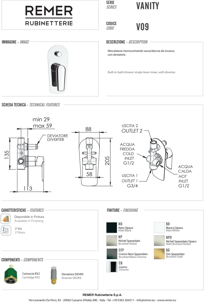 Смеситель для душа Remer из коллекции Vanity является идеальным выбором для создания современного и функционального душевого пространства. Этот однорычажный смеситель предназначен для скрытого монтажа и оснащен переключателем потока, что делает его использование максимально удобным и простым. Смеситель выполнен из высококачественной латуни и имеет стильную глянцевую поверхность в цвете хром. В комплект поставки входят только внешние компоненты (арт. V09), однако можно отдельно приобрести встроенные компоненты (арт. N09B) или полностью комплектный вариант. Строгая линия дизайна и гармоничная форма делают этот смеситель идеальным выбором для современного интерьера ванной комнаты.