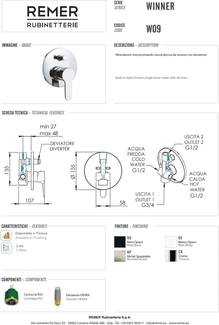 Представляем вашему вниманию смеситель для душа Remer Winner, модели W09, выполненный в элегантном хромированном глянцевом покрытии. Этот однорычажный смеситель предназначен для скрытого монтажа, что обеспечивает чистый и современный вид вашего душевого пространства. Благодаря встроенному переключателю потока, вы сможете легко управлять водными потоками, обеспечивая удобство и комфорт в использовании. В коллекции также представлены варианты, состоящие из только встроенных компонентов (арт. N09B) или исключительно внешних (арт. W09E). Смеситель изготовлен из высококачественной латуни, что гарантирует долговечность и устойчивость к коррозии. Идеальный выбор для тех, кто предпочитает современные решения в дизайне.