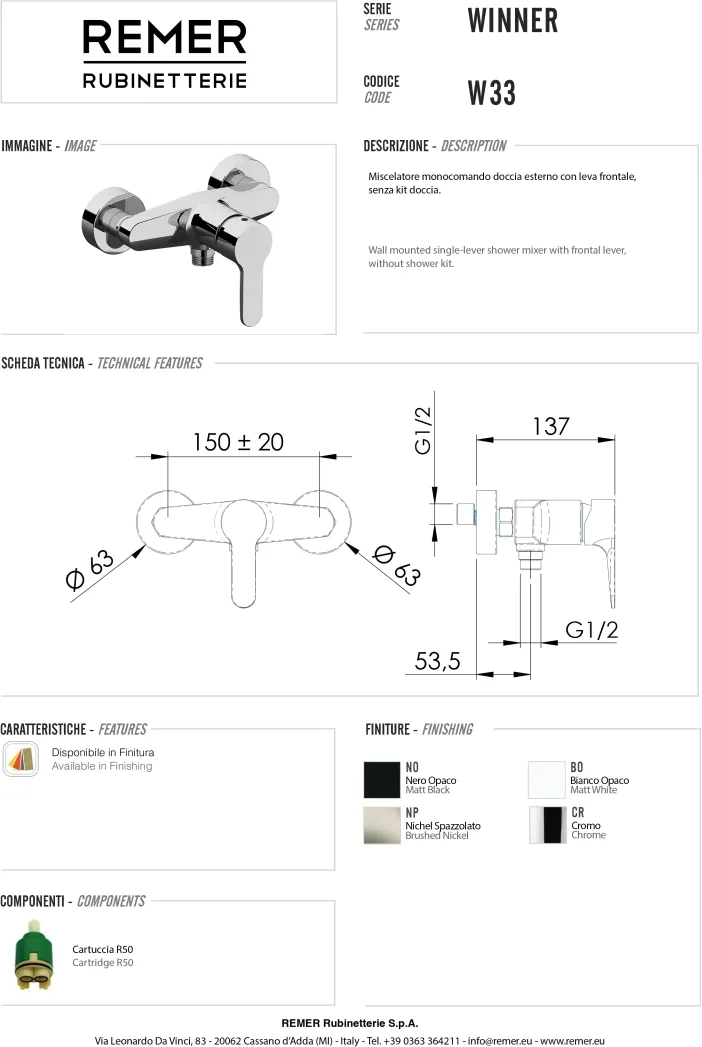 Смеситель для душа Remer Winner — это идеальное сочетание современного стиля и функциональности. Этот настенный смеситель выполнен из высококачественной латуни и покрыт глянцевым хромом, что обеспечивает ему долговечность и устойчивость к коррозии. Изделие предназначено для установки в душевых зонах и монтируется непосредственно на стену. Смеситель имеет рычажное управление, что делает его использование удобным и интуитивно понятным. Отсутствие излива подчеркивает современный дизайн изделия, а четкие формы и баланс задают стиль всей душевой зоне. В комплекте предусмотрены все необходимые элементы для монтажа с межосевым расстоянием 150 мм. Смеситель отвечает всем современным стандартам и требованиям к качеству. Гарантия на изделие составляет 5 лет, что говорит о его надежности и долговечности.