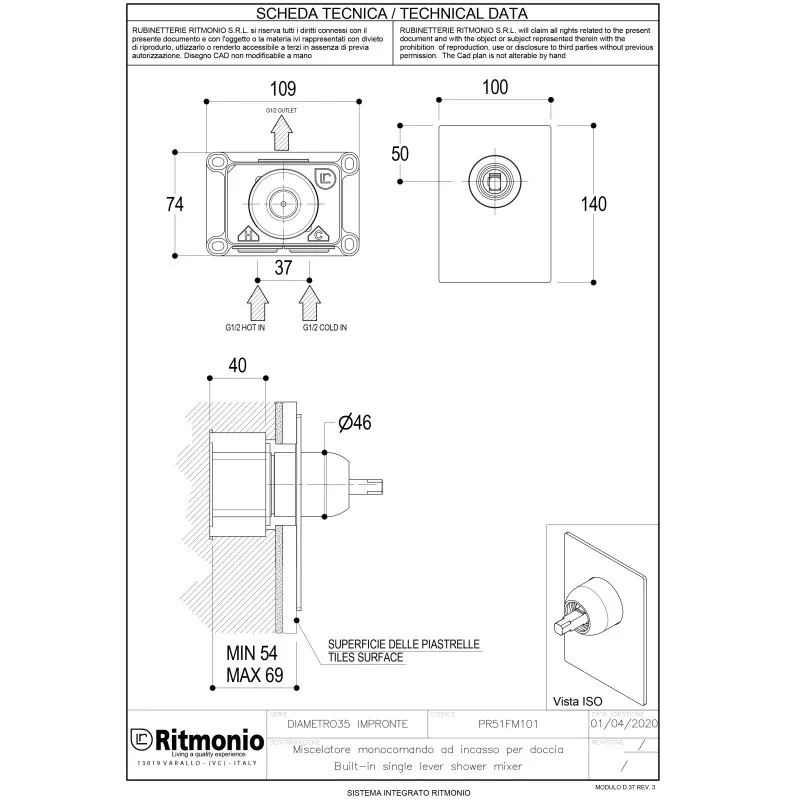 Смеситель для душа Ritmonio Diametro35 Impronte арт. PR51FN101CRL выполнен в элегантном хромированном цвете. Эта внешняя часть смесителя для душа предназначена для встраивания в стену. Управление смесителем осуществляется с помощью рычажного механизма, который использует керамический картридж для долгосрочной и надежной работы. Для завершения установки в корзину необходимо добавить внутреннюю часть смесителя E0BA0143, а также выбрать ручку из следующих вариантов: артикулы PR51MC104CRL, PR51MC103CRL, PR51MC102CRL или PR51MC101CRL. Это идеальный выбор для стильных и современных интерьеров ванной комнаты.