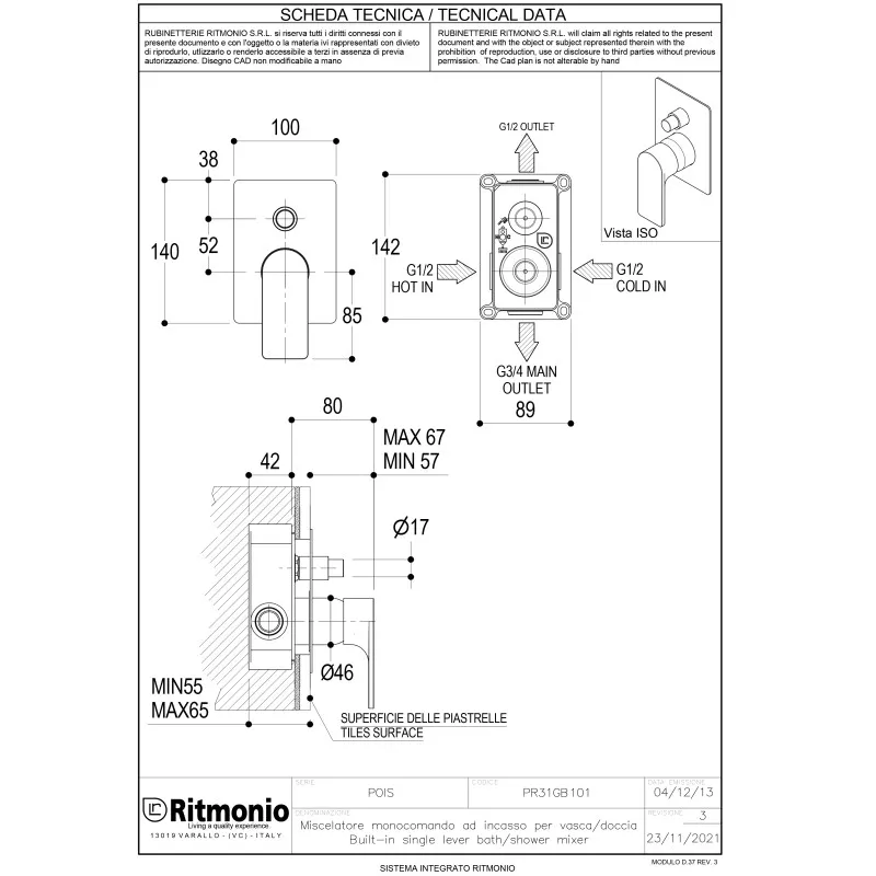 Смеситель для душа Ritmonio POIS, арт. PR31GC101CRL, выполнен в элегантном хромированном цвете. Этот смеситель предназначен для установки в стену и оснащён переключателем, что позволяет удобно управлять подачей воды. Управление осуществляется с помощью рычажного механизма, а керамический картридж гарантирует долгий срок службы устройства. Для окончательной установки в корзину необходимо добавить внутреннюю часть смесителя арт. E0BA0153.