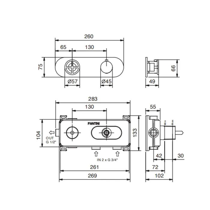 Смеситель для душа термостатический Fantini Fontane Bianche на 1 источник, наружная часть, Matt Gun Metal PVD 47 P5 P331B