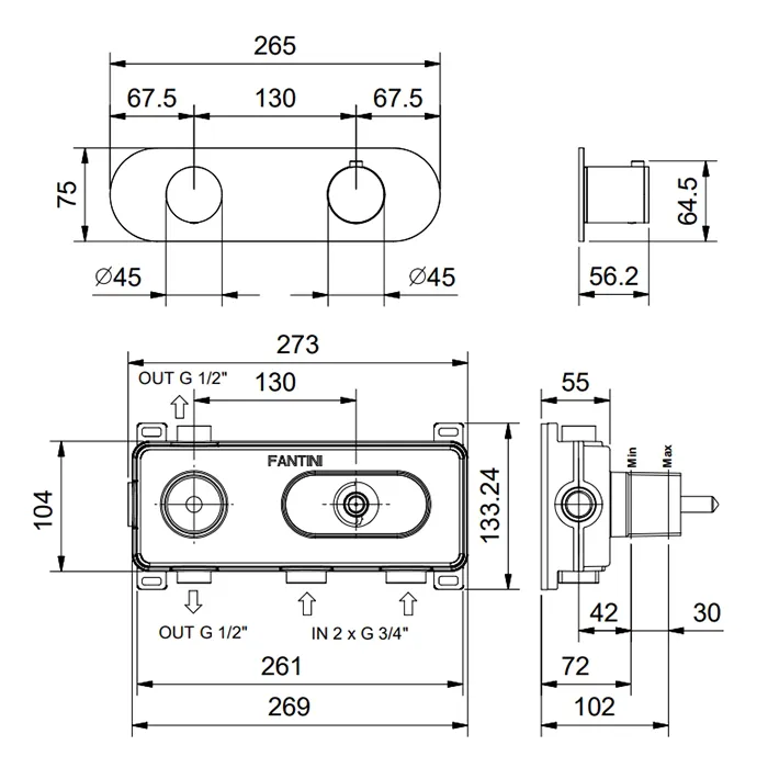 Смеситель настенный встраиваемый Fantini Aa/27 термостатический, с переключателем на 2 положения, внешняя часть, отделка матовая натуральная сталь 33 93 Y372B