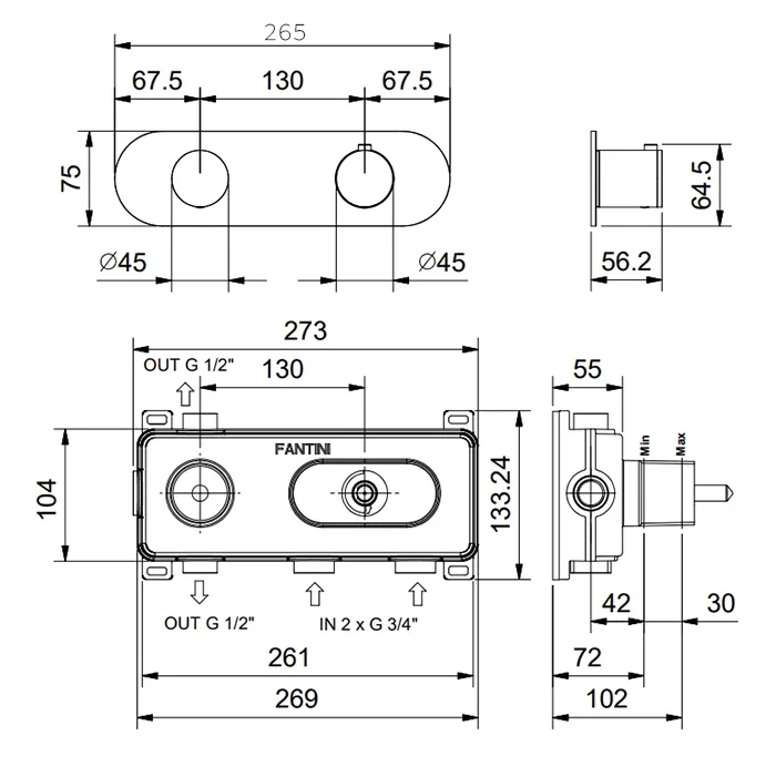 Смеситель настенный встраиваемый Fantini Aa/27 термостатический, с переключателем на 2 положения, внешняя часть, отделка Matt Gun Metal PVD 33 P5 Y372B