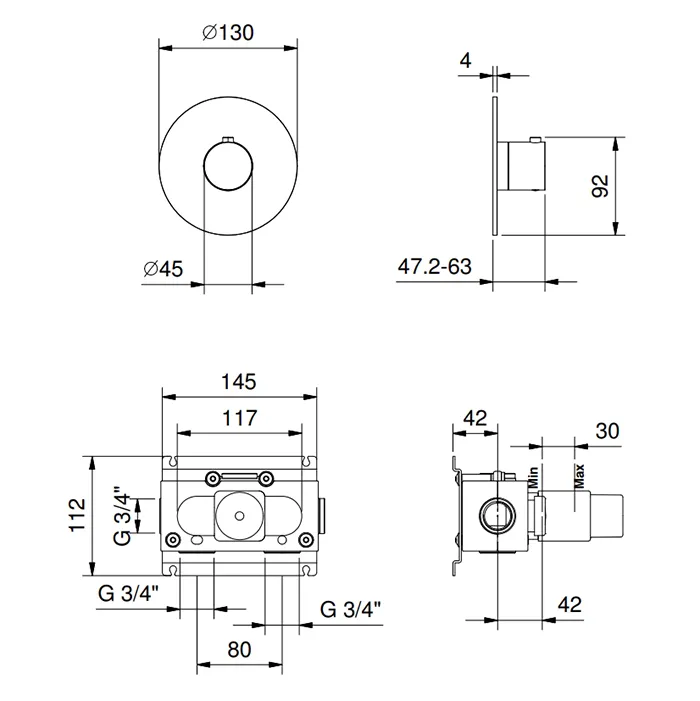 Смеситель настенный встраиваемый Fantini Aa/27 термостатический, внешняя часть, отделка Matt Gun Metal PVD 33 P5 Y300B