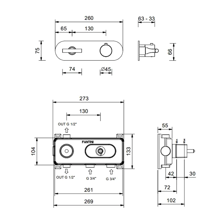 Смеситель настенный встраиваемый Fantini Sailing термостатический, с переключателем на 2 положения, внешняя часть, Deep Black PVD 67 S1 J272B