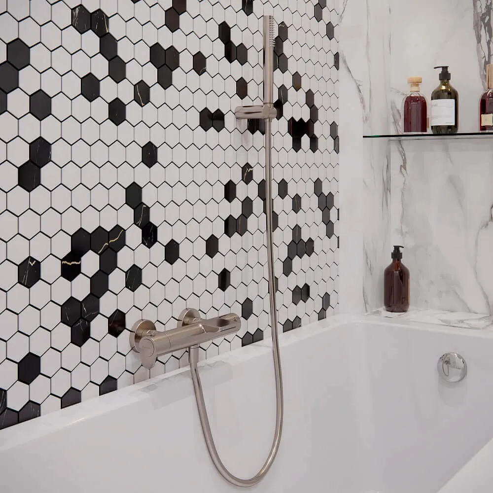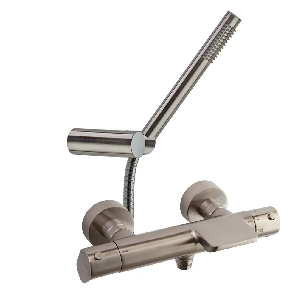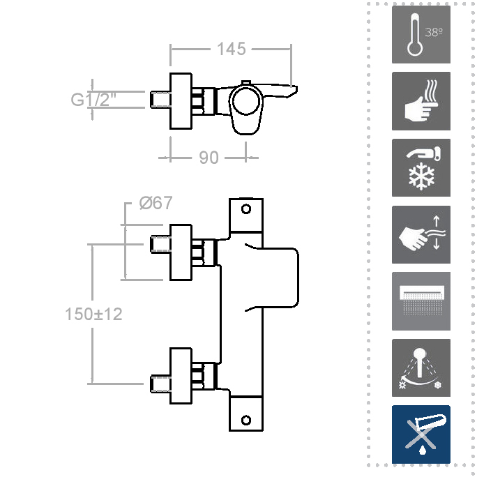 Смеситель выполнен из высококачественной хромированной латуни, что гарантирует долговечность и устойчивость к внешним воздействиям. Оснащенный термостатическим картриджем 1701 T + 4001, он позволяет точно фиксировать температурные настройки, создавая идеальный поток воды каждый раз. Уникальная функция TERMOSTOP BLOCK обеспечит вашу защиту, ограничивая температуру воды до безопасных 38° C.