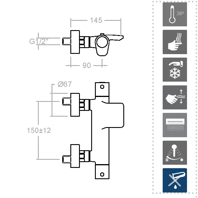 Корпус смесителя Alexia изготовлен из прочной и надежной хромированной латуни, которая дополнительно обработана PVD-покрытием для защиты от износа и коррозии. Центральное место в конструкции занимает термостатический картридж, который позволяет задать и поддерживать идеальную температуру воды, обеспечивая комфорт в каждый момент использования. Благодаря функции TERMOSTOP BLOCK вы навсегда забудете о случайных ожогах — система автоматически блокирует изменения температуры выше 38 °C.