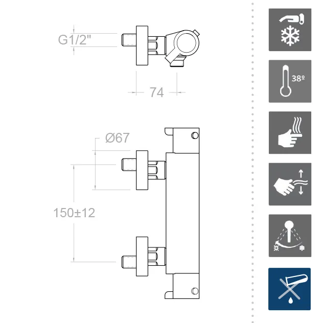 Вы останетесь под впечатлением от высокоточной работы термостатического картриджа, который обеспечивает оптимальную температуру воды, и никаких рисков благодаря системе защиты от ожогов Hot Block и функции Termostop на уровне 38° C. Насладитесь безопасностью с Cooltouch системой, которая предотвращает нагрев поверхности смесителя, обеспечивая комфортную эксплуатацию.