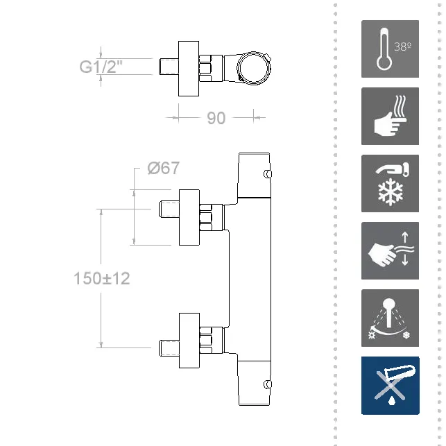 - Термостатический картридж: снабжен системой защиты от перегрева, с Termostop установкой на 38°С для вашего спокойствия.