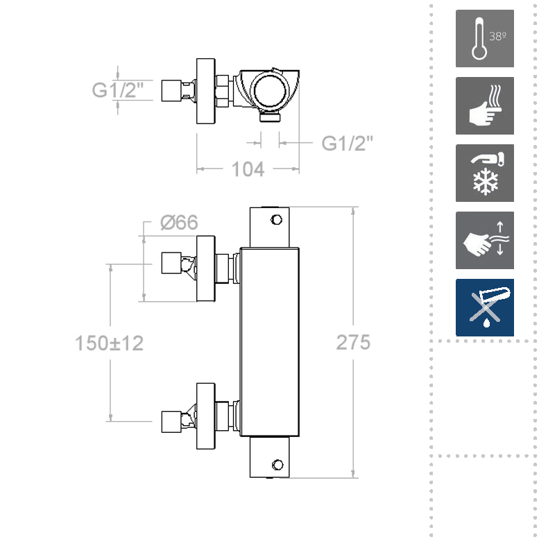 - Термостатический картридж обеспечивает блокировку температуры при комфортных 38°.