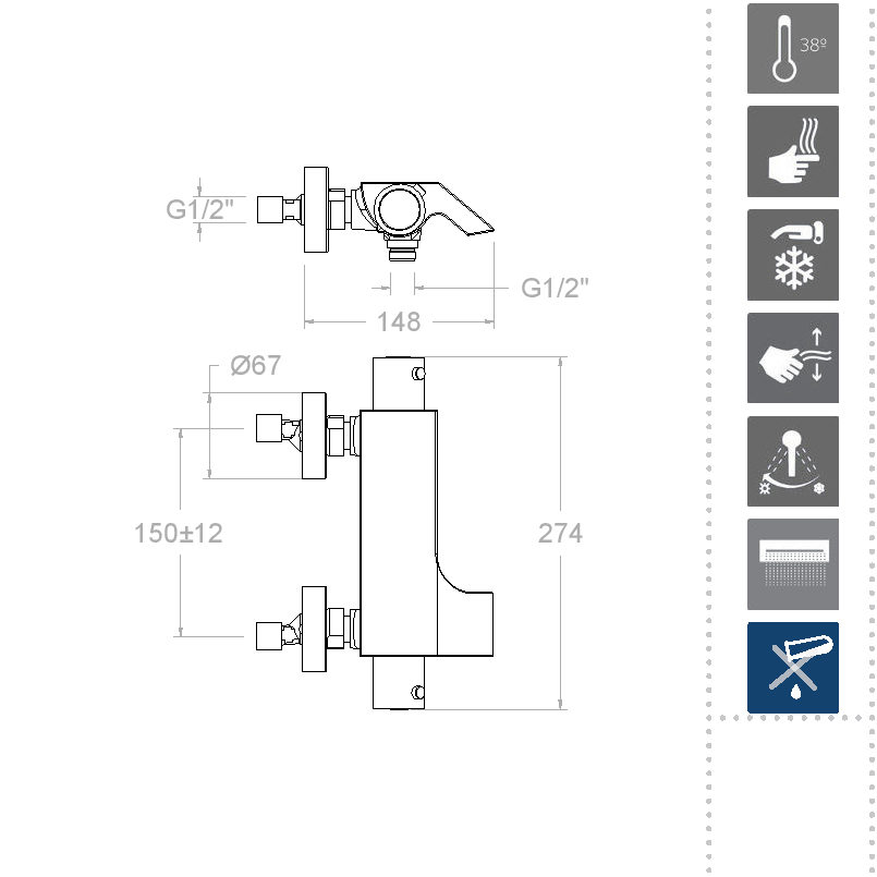 • HOTBLOCK — система, предотвращающая подачу слишком горячей воды при резком падении давления холодной воды (например, когда кто-то включил холодную воду в другом кране или произошёл слив). Эта система защищает от ожогов.
