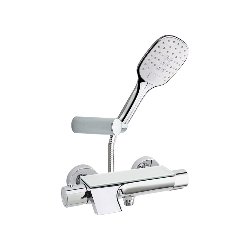 Ваше удовольствие от принятия душа повысится с наличием небольшого каскадного излива, превращающего струю воды в настоящий водопад. А стеклянная полка на корпусе смесителя обеспечит удобство и функциональность в использовании, позволяя хранить все необходимые средства под рукой.