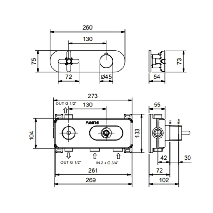 Термостат для душа Fantini Icona Classic на 2 источника, 3/4", наружная часть, Matt Gun Metal PVD 53 P5 R772B
