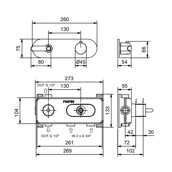 Термостат для душа Fantini Icona Deco на 2 ист, 3/4", наружная часть, хром 53 02 R872B