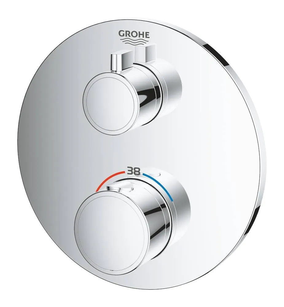 24075000 хром Grohtherm Термостат для душа с переключателем на 1 положение комплект верхней монтажной части для GROHE Rapido SmartBox 35 600 000 GROHE TurboStat встроенный термоэлемент GROHE StarLight хромированная поверхность с настенными розетками GROHE QuickFix (скрытые эксцентрики, уплотнение, скрытый монтаж) металлическая накладная панель, регулируемая на 6° GROHE SafeStop стопор безопасности при 38°C GROHE SafeStop Plus опционно огачничитиель температуры на 43°C, включен встроенные обратные клапаны и грязеулавливающие фильтры керамический запорный клапан, 120° распределения расхода: выход B или C = 27 л/мин без встроенного механизма