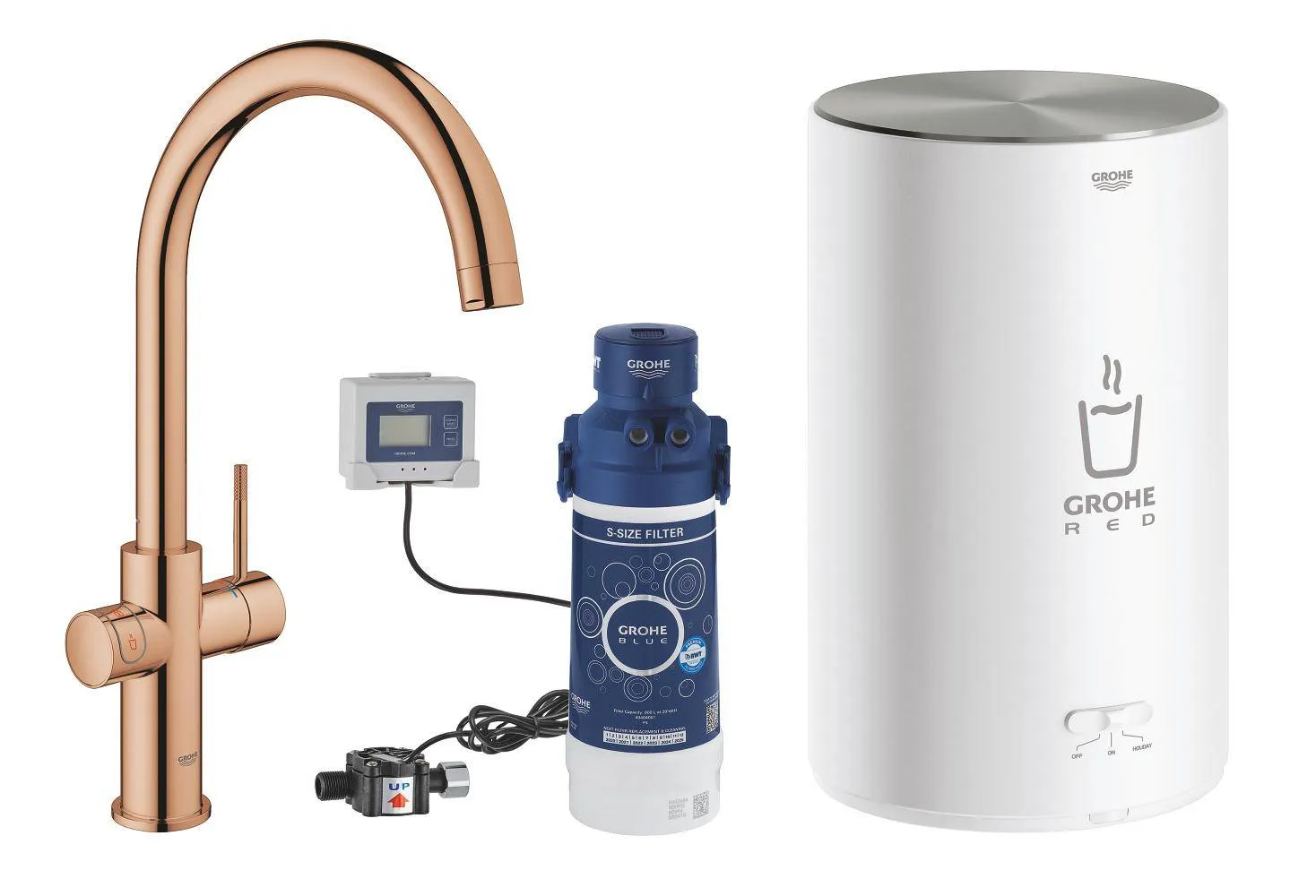 Комплект для кухни GROHE Red Duo II с бойлером M-size, смеситель с C-образным изливом, бронза 30083D