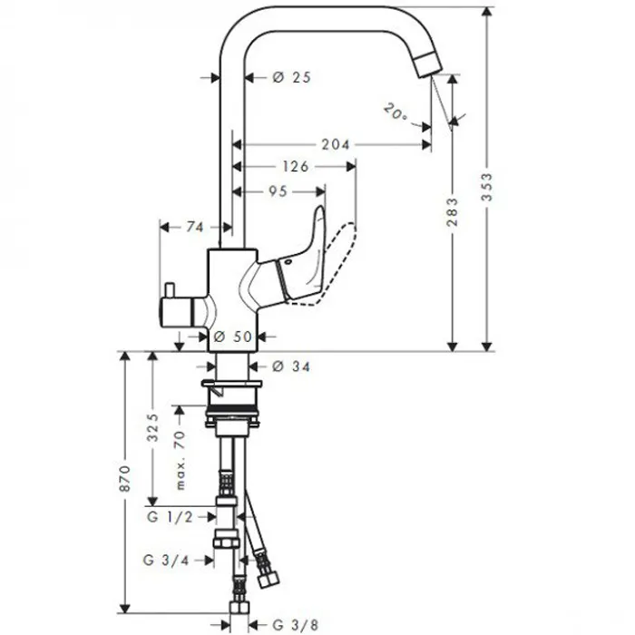 • угол поворота излива : регулировка на 3 уровня, на 110°, 150° или 360°