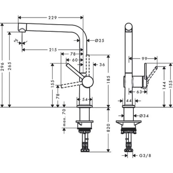 - угол поворота излива: регулировка на 4 уровня 60°, 110°, 150° или 360°