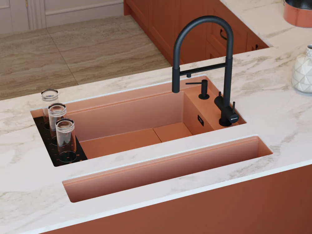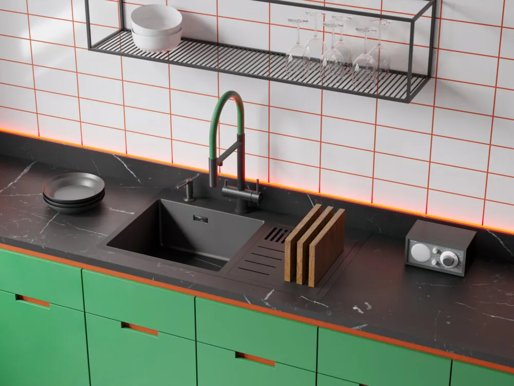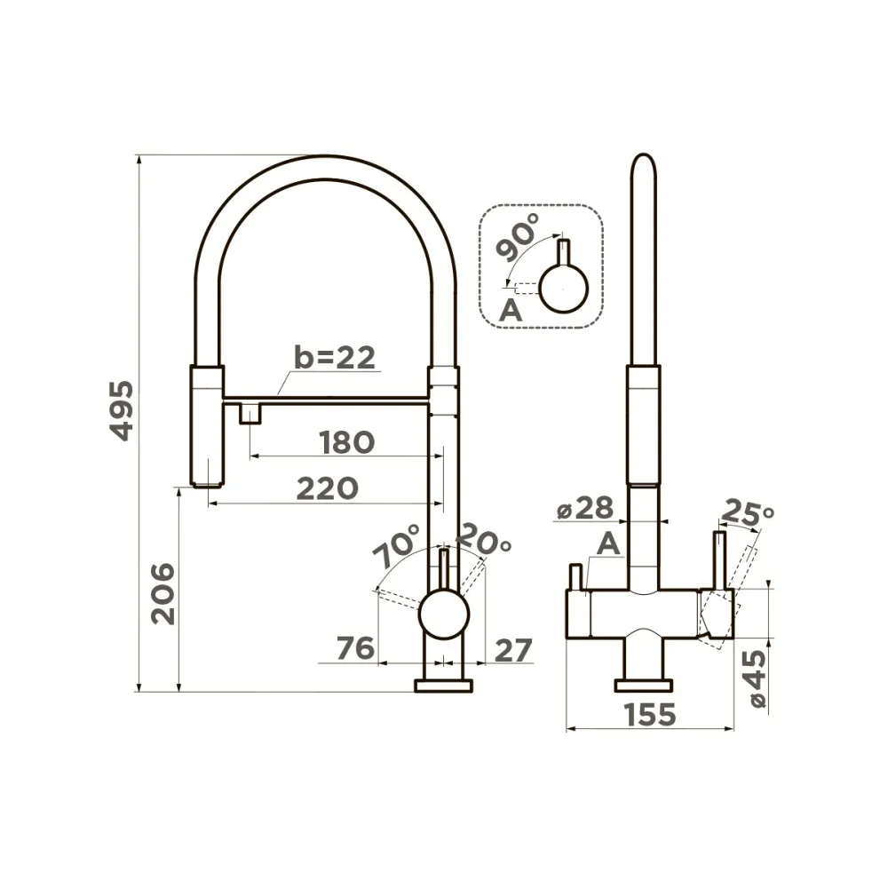 Вытяжной шланг обеспечивает удобство использования смесителя, которое заключается в возможности мытья труднодоступных мест и бережной очистке мелких столовых приборов. С его помощью также можно тщательно промывать овощи, фрукты и посуду после мытья без лишних брызг на столешницу вокруг мойки.