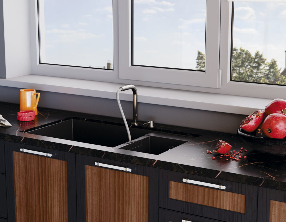 Вытяжной шланг обеспечивает удобство использования смесителя, которое заключается в возможности мытья труднодоступных мест и бережной очистке мелких столовых приборов. С его помощью также можно тщательно промывать овощи, фрукты и посуду после мытья без лишних брызг на столешницу вокруг мойки.