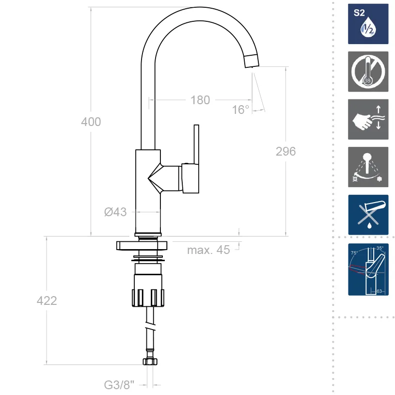 Этот однорычажный смеситель невероятно прост в применении. Регулировка температуры воды осуществляется одним движением рычага влево или вправо, а напор можно легко изменить движением сверху вниз.