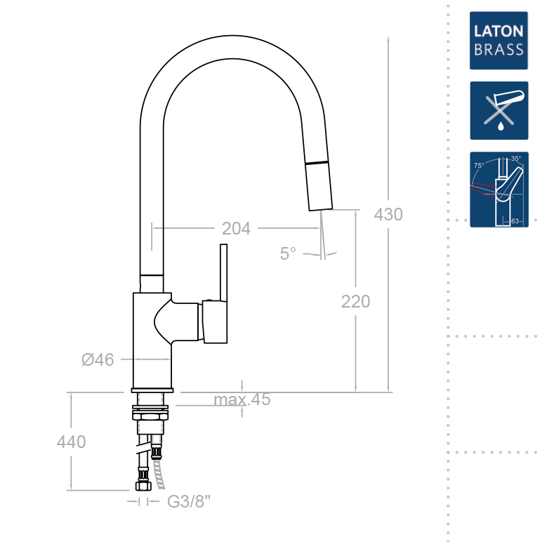Смеситель Drako уникален своей функциональностью. Однорычажная конструкция позволяет легко регулировать температуру и напор воды с помощью простого движения рычага, что обеспечивает быстрые и точные настройки. Благодаря наличию выдвижной лейки, вы с легкостью сможете достичь любой точки вашей раковины, что делает процесс мытья посуды невероятно удобным.