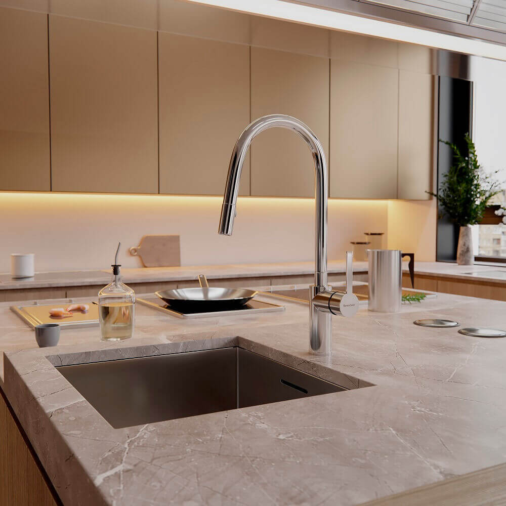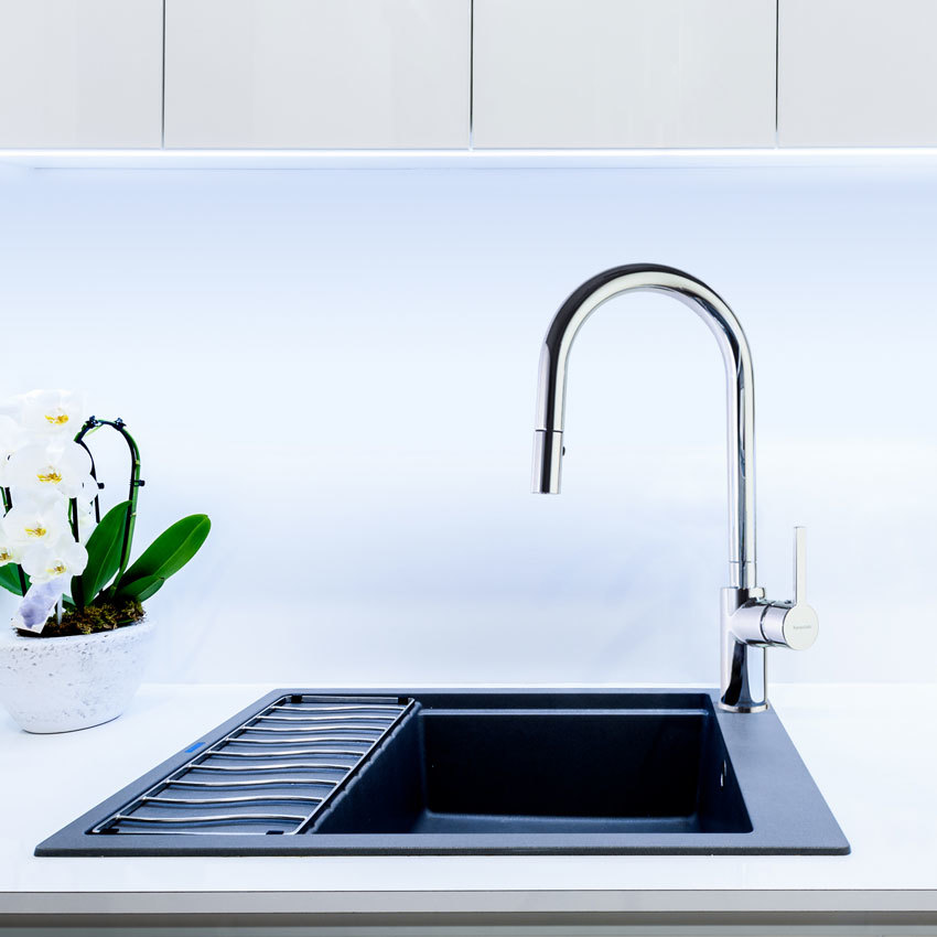 Смесители из серии Drako подходят для установки в разнообразных кухонных условиях, от небольших помещений до просторных кухонь с двойными мойками. Высокий или низкий излив может быть выбран в зависимости от глубины вашей раковины и наличия подвесных шкафов.