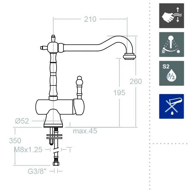 Смеситель для кухни Ramonsoler Gaudi 3129 — это не просто функциональный элемент, а настоящее произведение искусства, достойное украсить любую кухню. Выдержанный в классическом стиле, он гармонично вписывается в интерьеры, вдохновлённые винтажными традициями, подчеркивая их изысканность и элегантность.