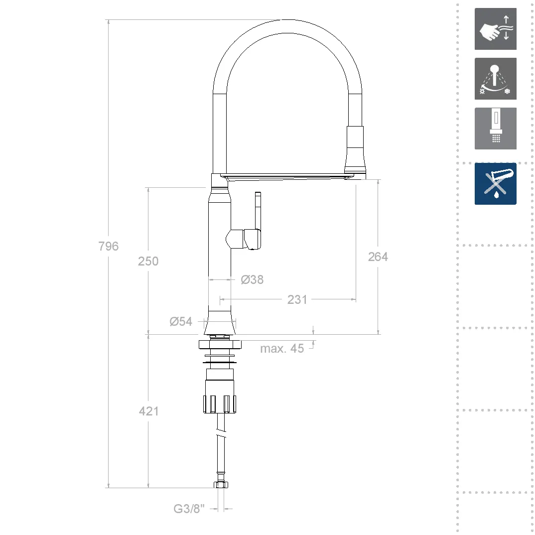 Рекомендуемое давление для работы смесителя — 3 бара, а температура горячей воды должна составлять около 55 °C, что обеспечивает оптимальные условия эксплуатации, сохраняя при этом энергоэффективность.