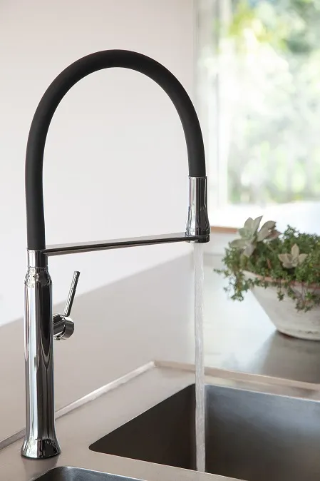 Оснащенный магнитным держателем, смеситель обеспечивает легкую и надежную фиксацию благодаря инновационной системе неодимовых магнитов. Такой механизм позволят установить лейку простым движением, возвращая её в исходное положение без труда. Гибкий силиконовый излив даёт возможность направлять поток воды в любую точку, что особенно удобно для мытья овощей, фруктов и наполнения емкостей любой высоты.