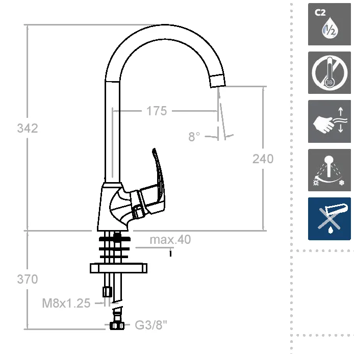 Смеситель рассчитан на оптимальное давление воды от 1 до 5 бар, при рекомендуемом давлении в 3 бара, что обеспечивает расход 12 литров в минуту при 3 барах и эффективную работу даже при высоких нагрузках. Рекомендуемая температура горячей воды составляет 55 °С, а эксплуатационная до 65 °C, обеспечивая оптимальный комфорт в использовании.