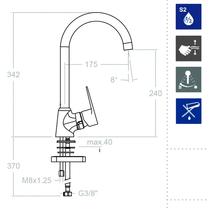 - Система экономии воды S2, обеспечивающая открытие ручки в два этапа для более рационального расхода.
