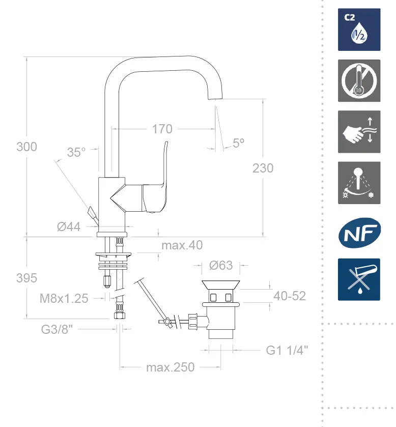 Однорычажный смеситель Ramonsoler Ypsilon обеспечивает максимальную производительность и простой контроль над температурой и напором благодаря удобному джойстику, который с легкостью перемещается в нужное положение. Это не только добавляет комфорт и экономит время — смеситель также проработает долгие годы, радуя вас своей надежностью и долговечностью.