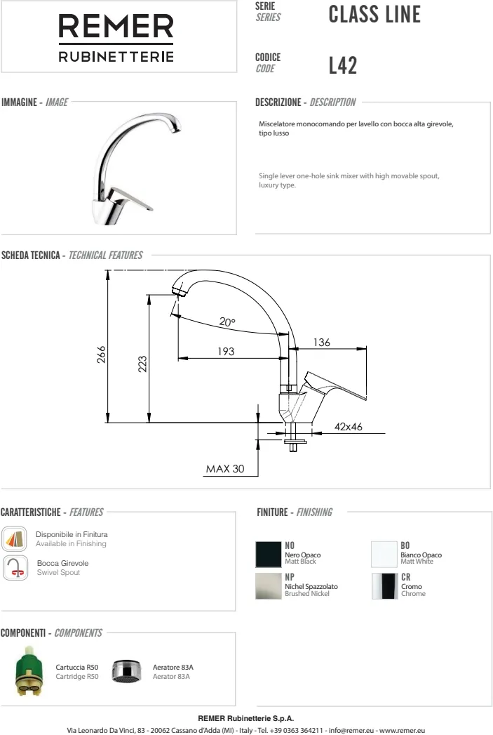 Смеситель для кухни Remer Class Line является не только функциональным, но и стильным решением для вашей кухни. Изготовленный из высококачественной латуни, он отличается современным дизайном и удобством в использовании. Высокий и поворотный излив позволяет с легкостью управлять потоком воды, что делает его идеальным выбором для любых кухонных задач. Однорычажное управление обеспечивает простоту регулировки температуры и давления воды. Смеситель оснащен аэратором, который способствует экономии воды и улучшает струю, делая её мягкой. Благодаря хромированному покрытию с глянцевой поверхностью, он устойчив к коррозии и легко вписывается в любой интерьер. С простым монтажом на одно отверстие на мойке, этот смеситель станет незаменимым элементом вашей кухни.