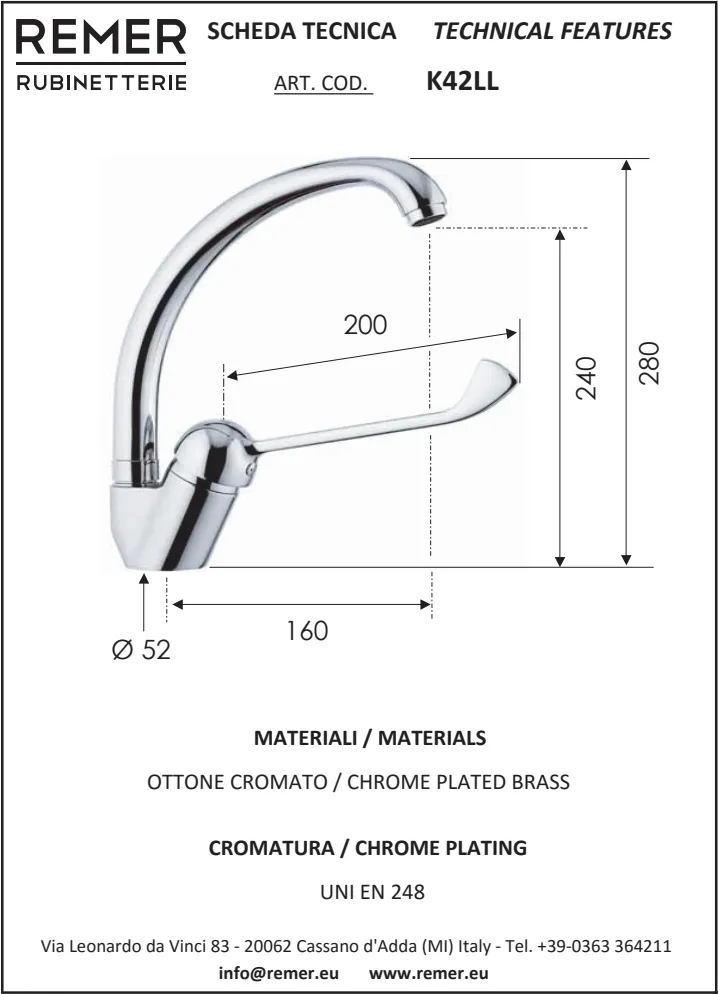 Представляем вам смеситель для кухни от бренда Remer, модель Kiss K42LL, выполненный в классическом стиле. Этот смеситель с высоким поворотным изливом и длинным удобным рычагом идеально подойдет для кухонных нужд. Изготовленный из качественной латуни с глянцевым хромированным покрытием, он не только долговечен, но и эстетически привлекателен. Классическая округлая форма и продуманное рычажное управление обеспечивают удобство и простоту использования, а также легкость в уходе. Этот смеситель рассчитан на монтаж на мойку и требует лишь одно отверстие для установки. Поворотный излив позволяет с легкостью наполнять даже высокие емкости, а высота излива в 240 см добавляет дополнительное удобство в использовании на кухне.