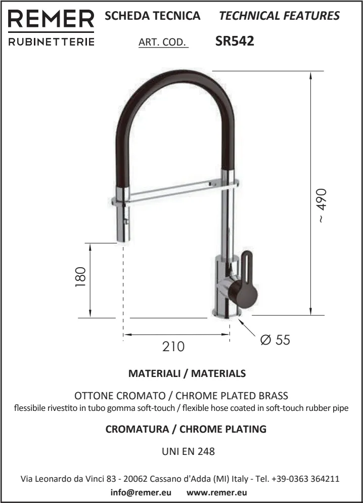 Однорычажный смеситель для кухни из коллекции ELEGANT GOURMET бренда Remer, представляет собой идеальное сочетание стиля и функциональности. Эта модель оснащена гибким шлангом, покрытым мягкой на ощупь резиной черного цвета, и латунной ручкой, покрытой черной матовой краской. Смеситель не только добавляет изысканный акцент к интерьеру вашей кухни, но и обеспечивает плавное и комфортное использование. Ручной душ можно легко извлечь из держателя и направить струю воды согласно вашим потребностям, существенно упрощая процесс мытья посуды и приготовления пищи.