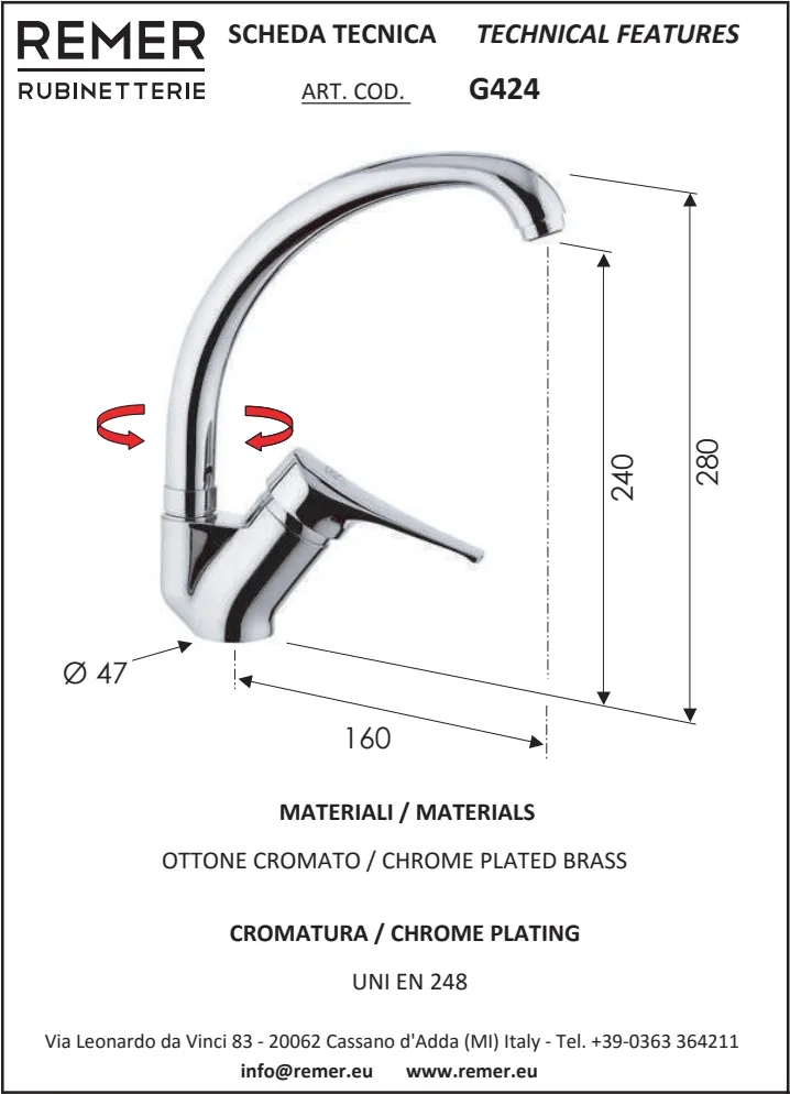 Смеситель для кухни Remer Giga Four представляет собой стильное и практичное решение для вашей кухни. Благодаря высокому поворотному изливу, этот смеситель обеспечивает удобное использование в самых разнообразных задачах на кухне. Изделие выполнено в классическом стиле и оснащено одним рычагом управления, что улучшает контроль над потоком и температурой воды.