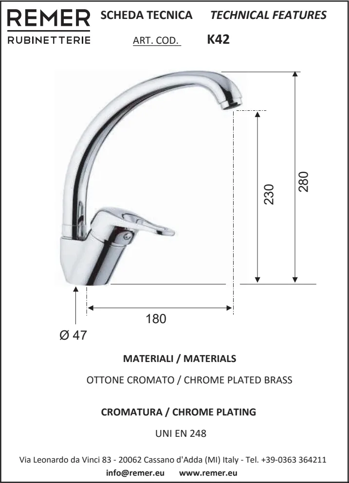 Представляем вашему вниманию смеситель для кухни Remer Kiss K42, отличающийся высоким качеством и изысканным дизайном. Этот однорычажный смеситель отличается высоким поворотным изливом, который обеспечит вам максимальное удобство в использовании и украсит вашу кухню. Выполненный в классическом стиле, он идеально впишется в любой интерьер и станет незаменимым помощником на вашей кухне.
