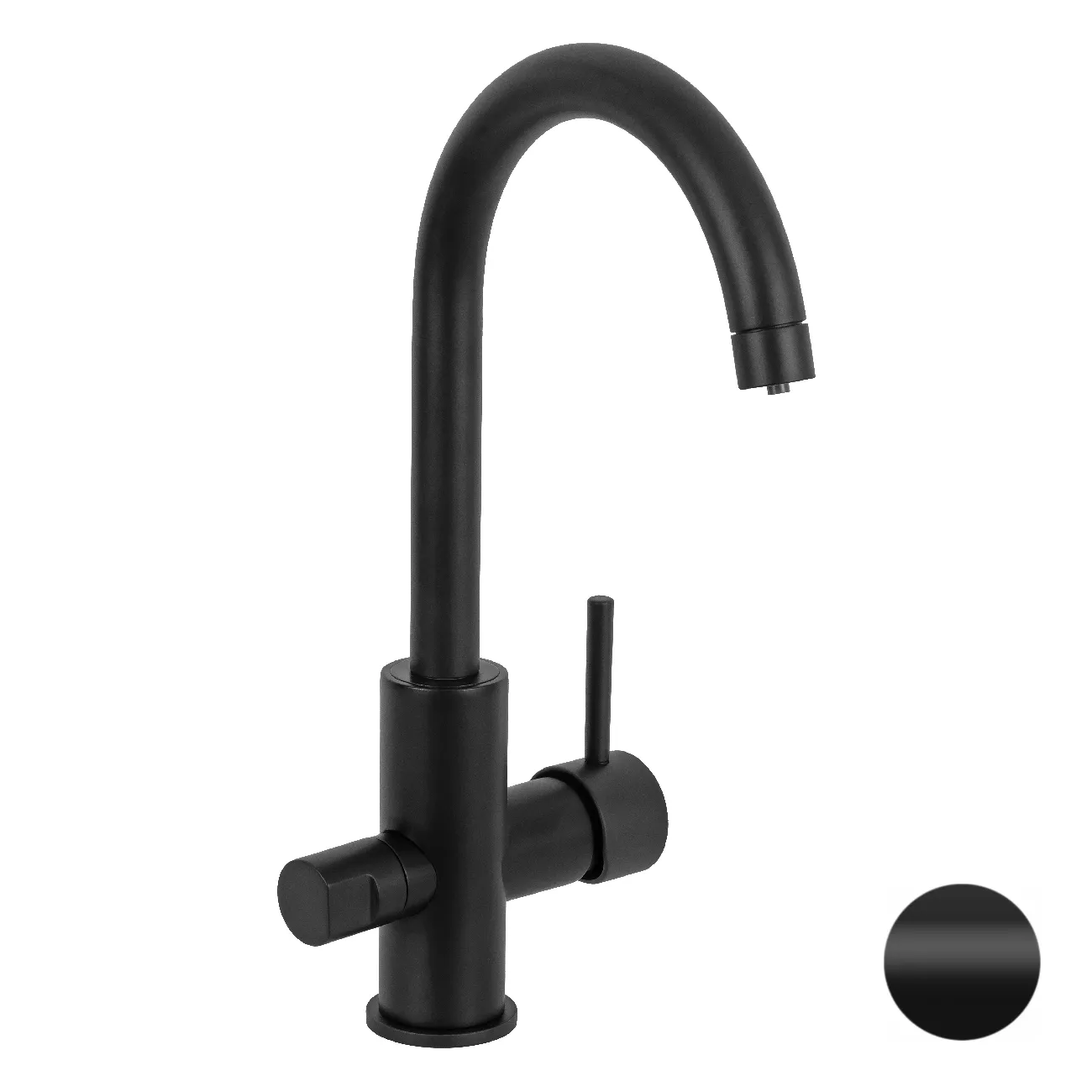 Смеситель изготовлен из прочной латуни с черной матовой отделкой, что придаёт ему современный вид и долговечность, а также защищает от коррозии и загрязнений. Идеален для современных кухонь, он предлагает высокую функциональность и элегантный дизайн. Особенность этого смесителя – его совместимость с системами очистки воды: подключите его к вашему уникальному фильтру-очистителю или выберите готовый комплект с фильтром BWT.