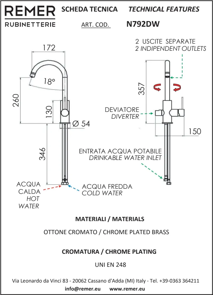 Смеситель для кухни Remer X-style – это высокопроизводительное и стильное решение для вашей кухни. Этот однорычажный смеситель предлагает три варианта подачи воды: горячая, холодная и специально очищенная вода. Благодаря поворотному изливу и двум независимым выходным потокам, вы легко сможете выбрать между смешанной и очищенной водой прямо на рычаге управления.