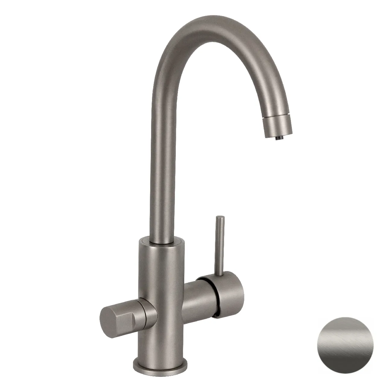 Смеситель для кухни Remer X-style – это идеальное решение для тех, кто ценит удобство и современный стиль. Этот 3-ходовой однорычажный смеситель с уникальным дизайном предлагает три входа: горячая вода, холодная вода и вода из фильтра, а также два полностью независимых выхода, что позволяет выбирать между смешанной проточной или очищенной водой. При помощи поворота рычага или самой головки можно легко переключаться между режимами. Этот смеситель станет отличным дополнением для вашего кухонного интерьера благодаря своей матовой никелированной поверхности и надежной конструкции из латуни. Для использования фильтрованной воды, вы можете подключить данный смеситель к любому очищающему устройству или выбрать наши комплекты с фильтром BWT.