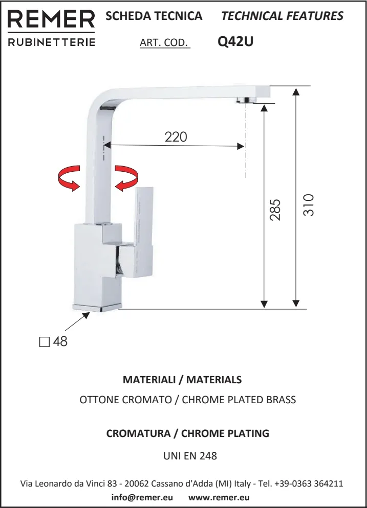 Смеситель для кухни Remer Qubika Q42U оснащен поворотным U-образным изливом, который обеспечивает максимальное удобство при использовании и интегрируется практически в любой кухонный интерьер. Эта модель属于 однорычажные смесители от Remer Rubinetterie, предлагающие разнообразие стилей и форм, что позволяет легко подобрать решение под ваш уникальный вкус и потребности.
