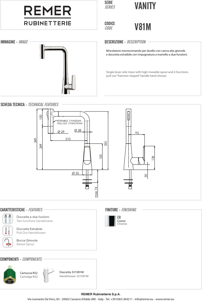 Представляем смеситель для кухни Remer из коллекции Vanity. Этот смеситель не только функционален, но и обладает современным и стильным дизайном, который гармонично впишется в интерьер вашей кухни. Смеситель оснащен высоким поворотным изливом и практичным выдвижным ручным душем с двумя режимами напора, позволяя легко справляться с различными кухонными задачами. Рычажное управление обеспечивает удобство использования, а долговечная конструкция из латуни гарантирует надежность и долговечность изделия. Глянцевая хромированная поверхность придаст блеск и элегантность вашему кухонному пространству.