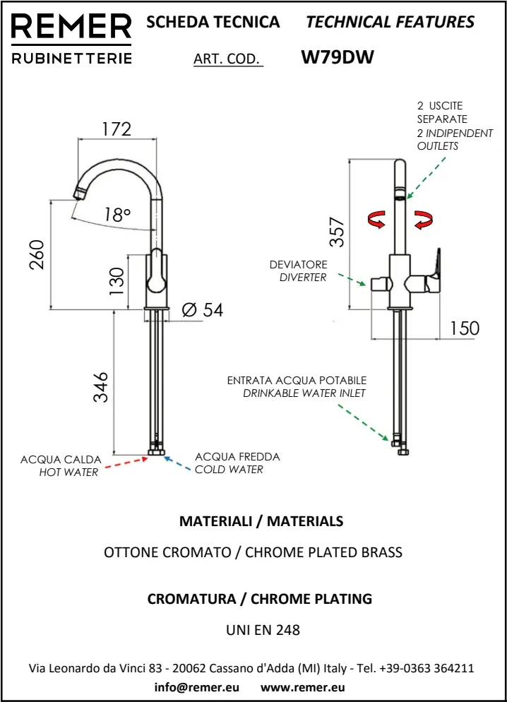 Смеситель для кухни Remer Winner с одним рычагом представляет собой инновационное решение для удобного распределения очищенной и обычной воды. Он оснащен поворотным изливом и двумя полностью независимыми выходами с возможностью выбора питьевой воды прямо с рычага. Трехпоточечное подключение позволяет использовать горячую, холодную и очищенную воду, выбирая между смешанной проточной водой или очищенной водой. Открытие, закрытие и регулировка температуры воды осуществляется традиционно с помощью рычага. Для установки устройства требуется подключение к выбранному вами устройству очистки воды, либо можно воспользоваться нашими новыми комплектами с набором BWT для очистки воды.